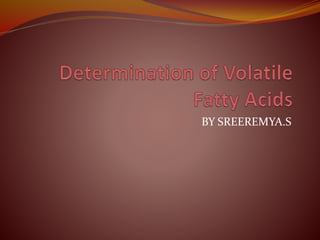 This document compares analytical methods for determining volatile fatty acids (VFAs) in environmental samples. It finds that direct potentiometric titration provides acceptable accuracy over 97% and precision in the range of 1.8-15%. The distillation method had poor recovery around 53-58% and higher limit of quantification. Spectrophotometric and gas chromatography methods are also evaluated. VFA concentrations can range from parts per million in surface water to thousands of parts per million in landfill leachates. The document explores methods for separating and quantifying VFAs like acetic acid using distillation, titration, spectrophotometry and ion exchange.