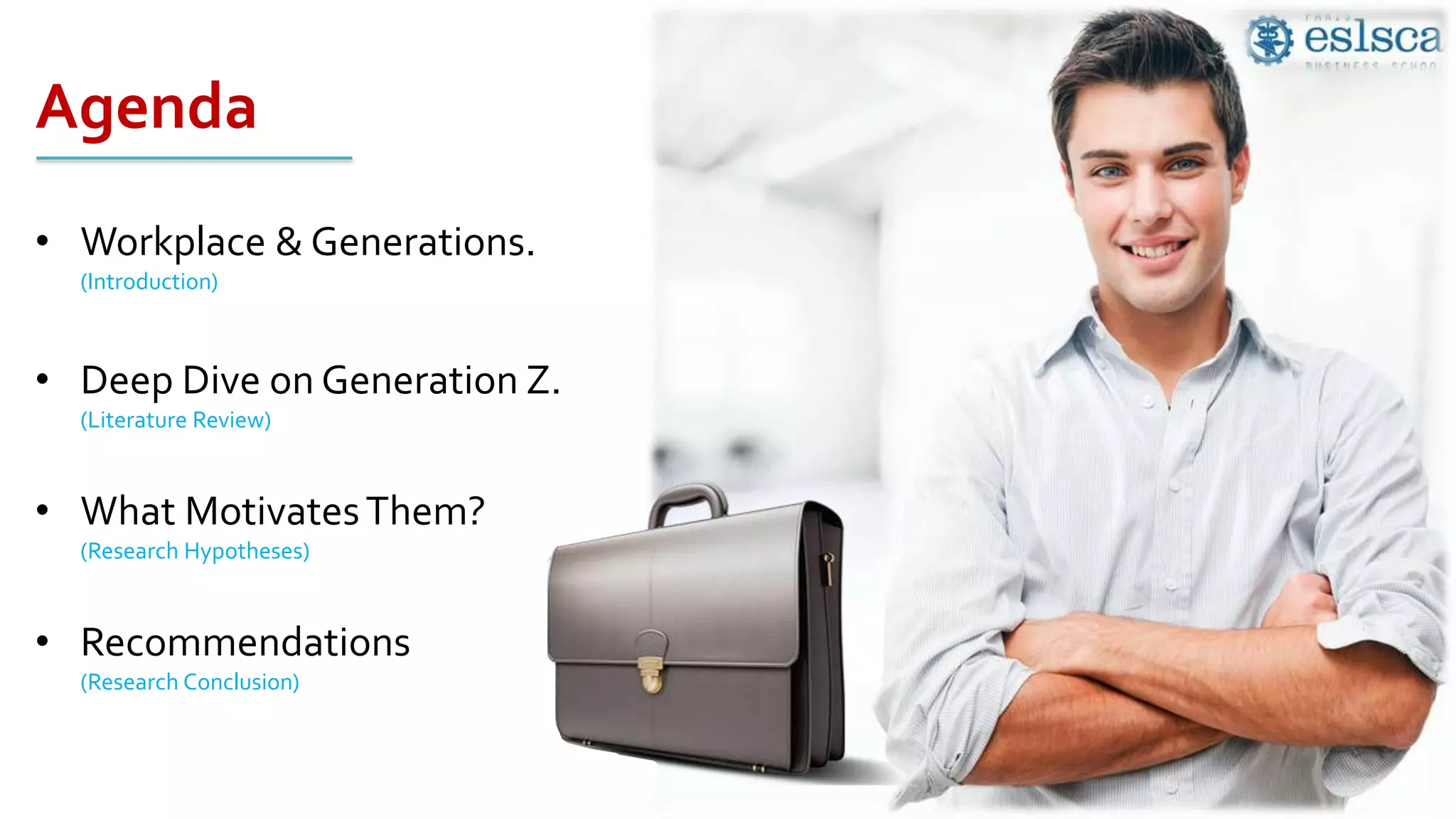 This thesis examines factors affecting motivation levels in Generation Z employees. It reviews motivation theories and literature on how Generation Z prefers communication, learning, and values at work. The thesis hypothesizes that transparency, recognition, visual training, unique work experiences, career development opportunities, modern tools, and collaboration positively impact Gen Z motivation. Based on the research, the conclusion recommends that management provide recognition, engaging jobs, career growth, technology, transparency, and social interaction to motivate young Generation Z workers.