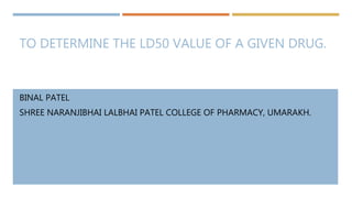 This document describes the process for determining the lethal dose at which 50% (LD50) of test animals die following administration of a drug. Mice are divided into groups that receive varying doses of the test drug, either procaine hydrochloride or pentobarbital sodium, via injection. Mortality rates are recorded and converted to probit values, which are then plotted against the log dose to determine the LD50 value, found to be 105.9 mg/kg for procaine hydrochloride in mice. The LD50 provides a measure of a drug's acute toxicity.