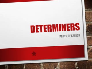 Determiners are words that introduce a noun and provide information about it without describing it. There are four main types of determiners: articles, demonstratives, possessives, and quantifiers. Articles include the definite article "the" and indefinite articles "a" and "an". Demonstratives are words like "this" and "that" that point to nouns. Possessives indicate noun possession, like "my" or "Sam's". Quantifiers provide information about quantity, such as "all", "some", or number words. Determiners must precede a noun or noun phrase.