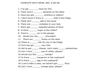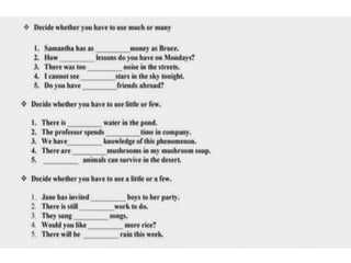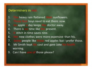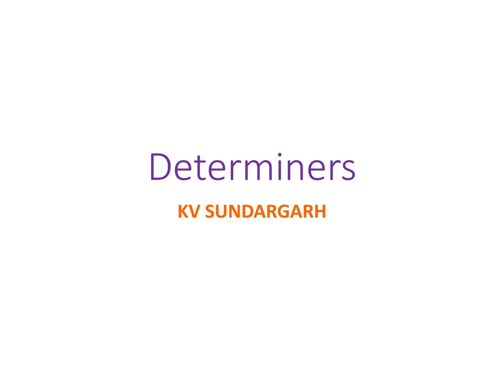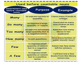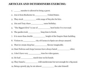 This document discusses different types of determiners in English including indefinite articles like "a" and "an", definite articles like "the", and quantifiers like "many" and "much". It provides examples of when to use indefinite versus definite articles, as well as situations that take zero articles like types of institutions. Key uses of "the" include with unique things, well-known designations, specific singular and plural nouns, directions, geographical areas, and various other proper nouns for groups, movements, instruments, and systems.