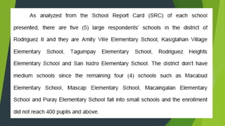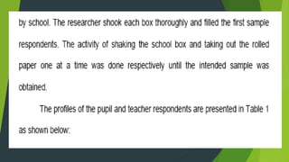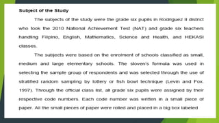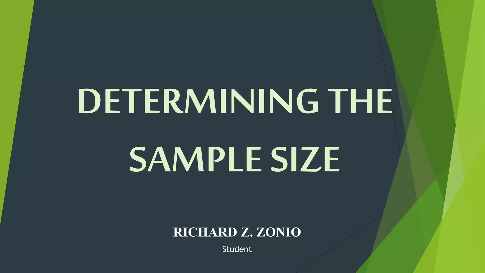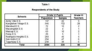 Slovin's formula is used to determine sample size from a given population. The formula is n=N/(1+Ne^2) where n is the sample size, N is the population size, and e is the desired margin of error. For a population of 9,000 people with a 2% margin of error, the sample size would be 1,957 according to the formula. Stratified random sampling is then used to determine sample sizes from subgroups to ensure representation.