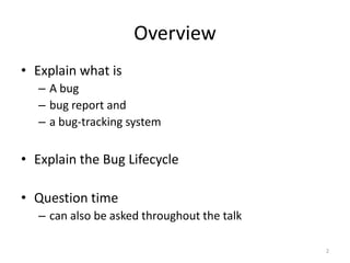 This document provides an overview of change management and bug tracking using Bugzilla as an example tool. It explains what a bug and bug report are, describes the Bugzilla bug tracking system and its open source nature. It then outlines the basic bug lifecycle process in Bugzilla of finding, reporting, assigning, resolving, verifying, reopening and closing bugs.