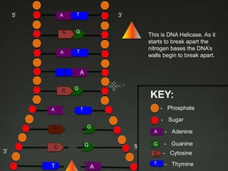 The document depicts the process of DNA replication through a series of diagrams: