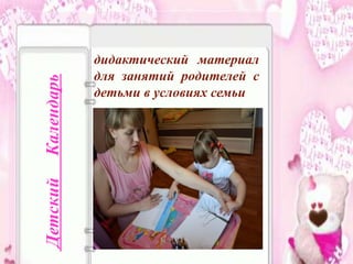 Документ описывает детский календарь, разработанный для родителей и детей, с целью создания образовательного пространства и сотрудничества между семьей и детским садом. Он включает в себя различные виды деятельности и игры, направленные на развитие ребенка, а также алгоритм внедрения этих материалов в воспитательный процесс. Основные преимущества использования календаря заключаются в улучшении взаимодействия родителей и педагогов, повышении активности родителей и организации совместного времени с детьми.