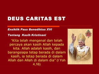 Ensiklik 'Deus Caritas Est' oleh Paus Benediktus XVI membahas konsep kasih dalam iman Kristiani, yang berakar pada ayat 1 Yohanes 4:16 bahwa 'Allah adalah kasih.' Dokumen ini terdiri dari dua bagian, yang pertama membahas teologi kasih, dan yang kedua tentang praktik kasih dalam Gereja sebagai pelayanan kasih. Dengan menekankan bahwa kasih bukan hanya perintah, tetapi respons terhadap kasih ilahi, ensiklik ini mengajak pembaca untuk menghidupi kasih di dunia yang membutuhkan.