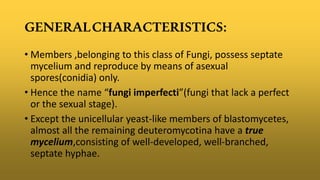 This document provides information on the classification of Deuteromycotina (fungi imperfecti). It discusses their key characteristics such as reproducing asexually through spores called conidia and lacking a sexual stage. The classes of Deuteromycotina are described as Hyphomycetes, Coelomycetes, and Blastomycetes. Hyphomycetes produce conidia directly on their substrate or in specialized fruiting structures. Coelomycetes produce conidia inside enclosing structures like pycnidia or acervuli. Blastomycetes are yeast-like and propagate by budding. Examples and characteristics of each class are given.