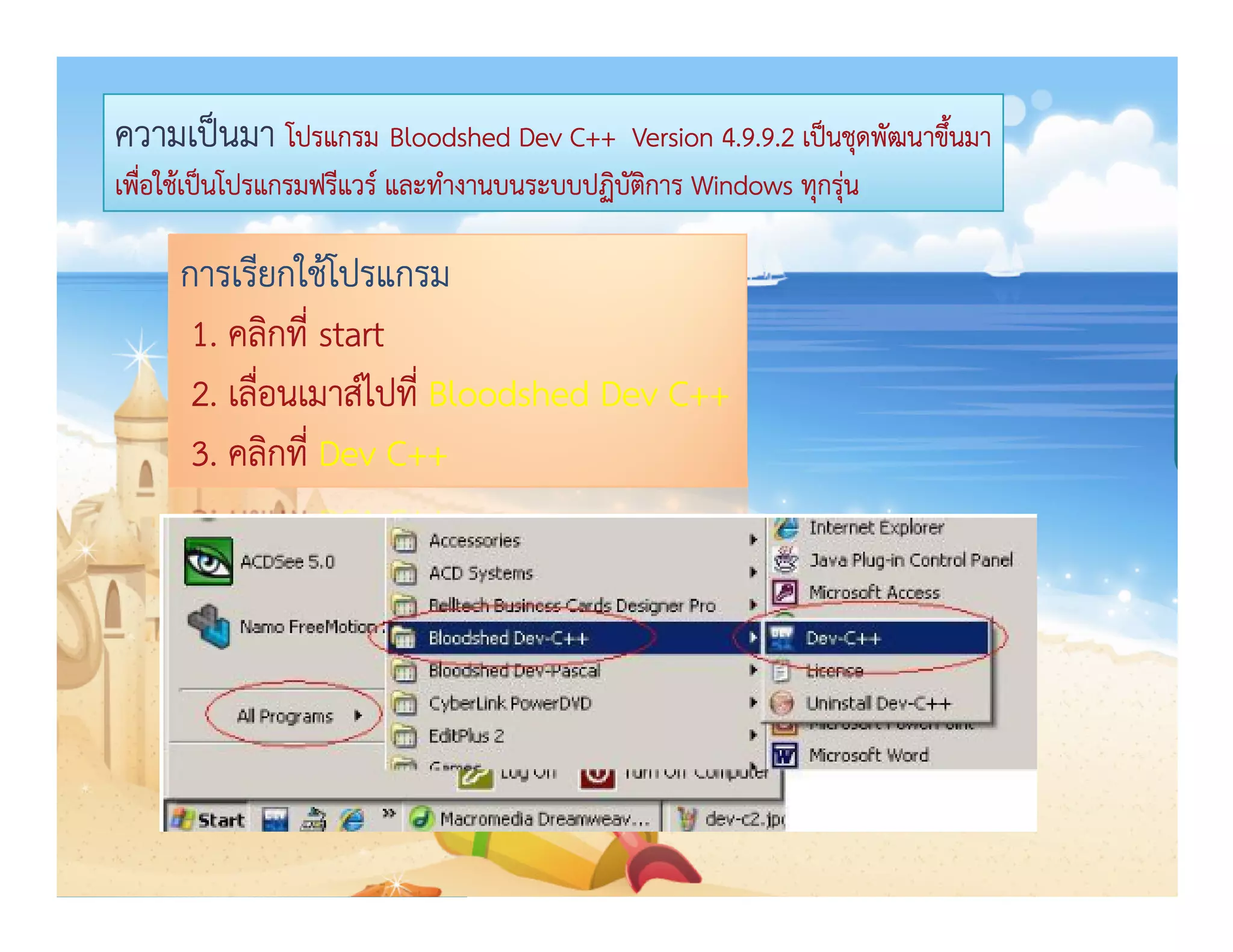 การเข้าใช้โปรแกรมซี Dev C++ 1. 2. ความเป็นมา โปรแกรม Bloodshed Dev C++ Version 4.9.9.2 เป็นชุดพัฒนาขึนมา