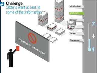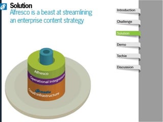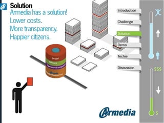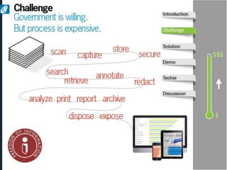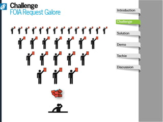 The document discusses Armedia's FOIA request solution and services. Armedia uses Alfresco, the largest open source content management platform, to provide enterprise content management including FOIA request management. Armedia offers implementation and advisory services for portal design, document scanning, and custom applications. It is a certified 8(a), veteran-owned, and minority-owned small business that can assist government agencies with FOIA requests.