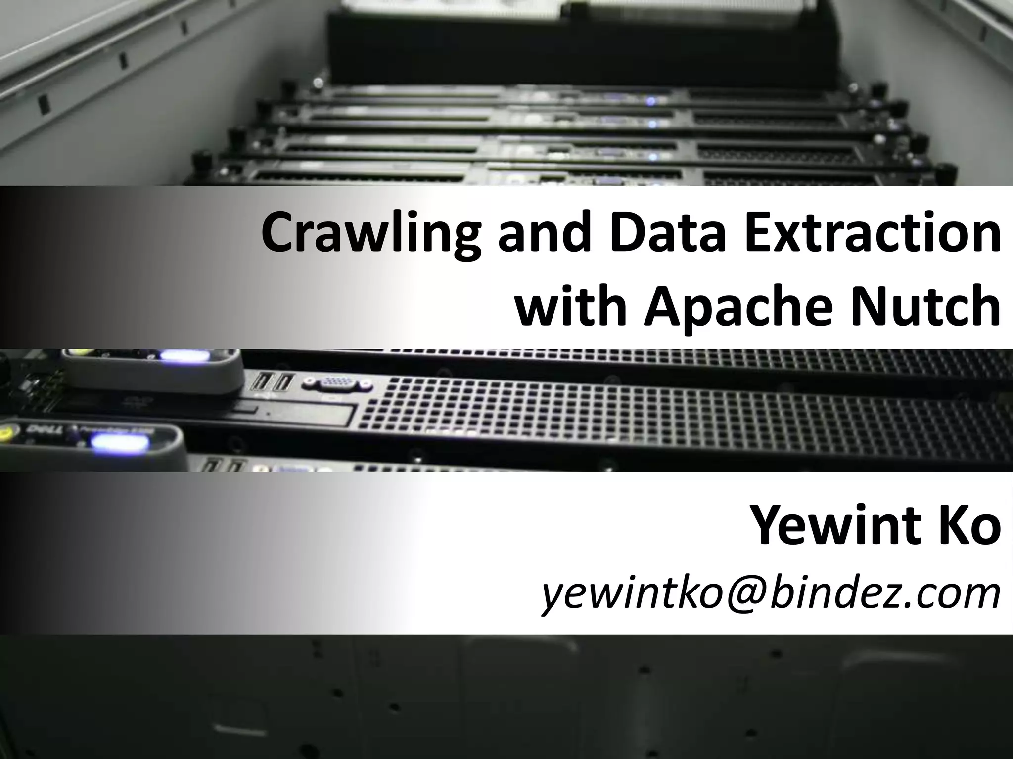 The document discusses Apache Nutch, an open source web crawler software project. It provides an overview of Nutch including its history and community, the Nutch crawling lifecycle of injecting, generating, fetching, parsing and updating URLs, how to extend Nutch through plugins, opportunities to use Nutch for analyzing Myanmar web content, and resources for learning more about Nutch. The presenter is the cofounder and architect of Bindez.com who has experience in web archiving, information retrieval and the Myanmar IT industry.