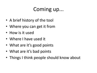 LLBLGen Pro is an ORM tool that generates a complete data access tier and business object layer from a database schema. It has been around for over 5 years and is easy to use. The developer designs the database, points LLBLGen Pro to it, selects the tables and views to include, and generates the .NET code. This provides an immediate DAL and business objects. LLBLGen Pro supports many databases and .NET versions and has features like auditing, validation, and SOA support. It is inexpensive and has benefits like ease of use, extensibility, and encouraging good database design. The developer provides several examples of using it successfully in applications.