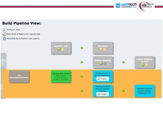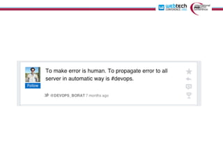 Johann-Peter Hartmann from Mayflower GmbH gave a presentation on practical DevOps for developers. The presentation covered three main points: (1) managing development environments with Vagrant and VeeWee, (2) managing configuration with Puppet or Chef, and (3) including the configuration as part of source code by placing Puppet/Chef files in a "configuration" folder within the code repository. The goal is to enable reliable and repeatable development environments that are consistent with production.