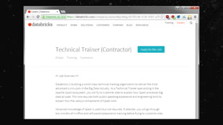 The document provides an agenda for a DevOps advanced class on Spark being held in June 2015. The class will cover topics such as RDD fundamentals, Spark runtime architecture, memory and persistence, Spark SQL, PySpark, and Spark Streaming. It will include labs on DevOps 101 and 102. The instructor has over 5 years of experience providing Big Data consulting and training, including over 100 classes taught.