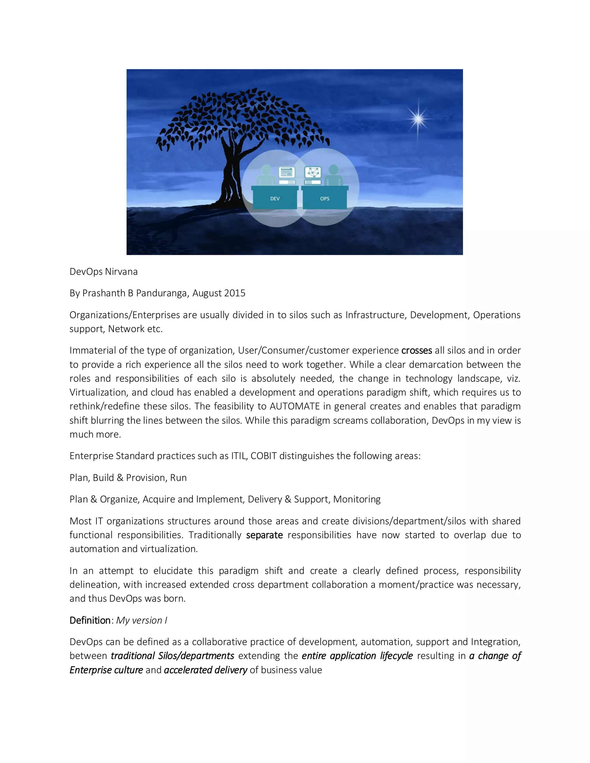 DevOps aims to break down silos between development and operations teams through increased collaboration. It promotes automating processes across the entire application lifecycle. Achieving a DevOps "nirvana" requires a change in organizational culture, including tearing down silos, implementing transparency, and gaining executive support for continuous improvement. Barriers include resistance to changed roles and security concerns, but benefits include reduced costs, faster delivery, and improved collaboration.
