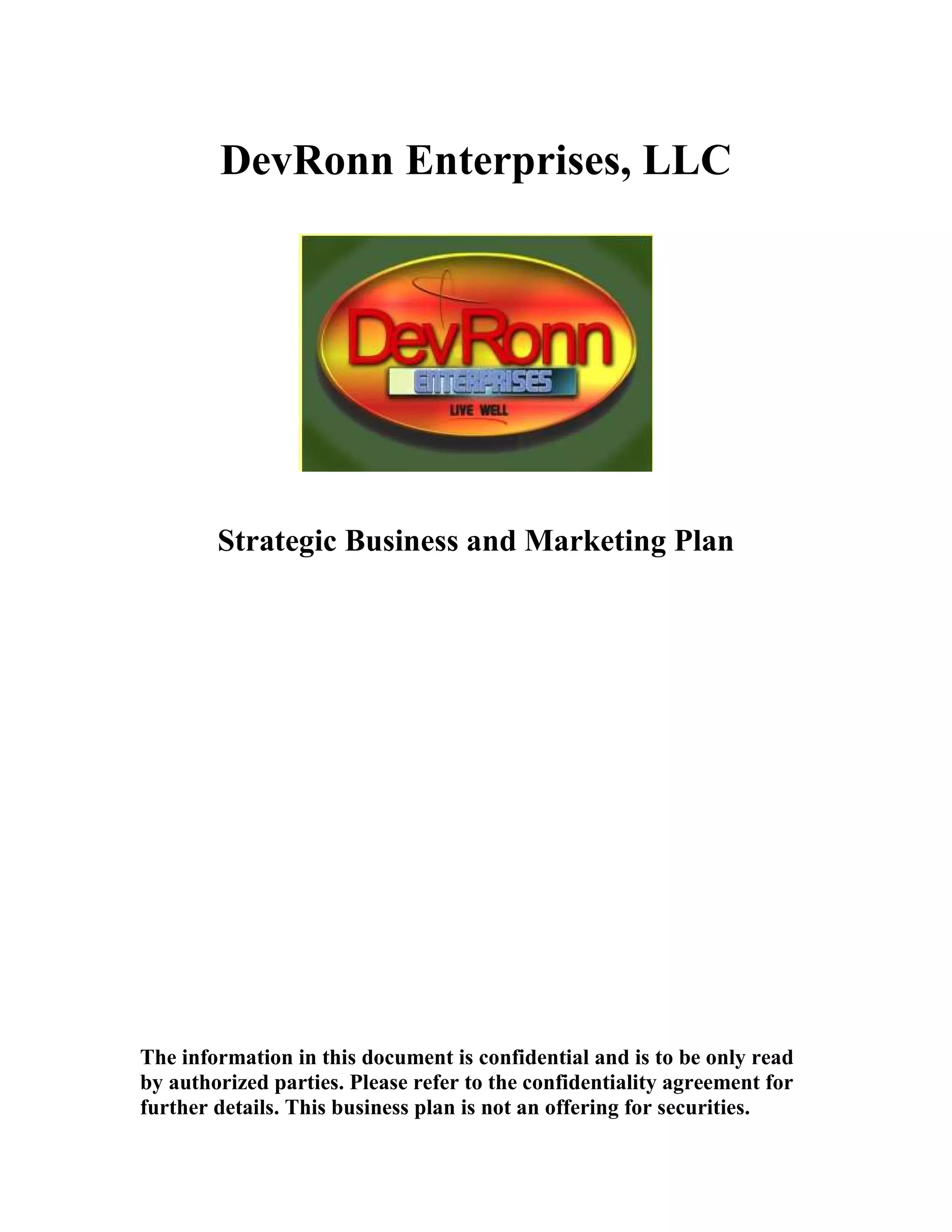 Devronn Enterprises, LLC is seeking to raise $1,000,000 to expand its specialty food business, particularly its flagship product line of cajun spices developed by founder Devin Devasquez. The business plan details operations, marketing strategies, and financial forecasts aiming for $6,000,000 in revenue by the fifth year, with a focus on building a strong brand presence and expanding distribution. The document emphasizes the confidentiality of the information and outlines the company's mission, objectives, and organizational structure.