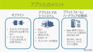 で 作られたアプリケーションを ネイティブな “hosted” アプリに 一括変換 http://www.manifoldjs.com/ Web でも、ローカルでも (npm でインストール) iOS
