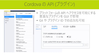 Cordova が提供する機能 デバッグ > 4.4 : 〇 < 4.4 : × iOS : × • Android 2.33+(4.4◎) • iOS 6 , 7 , 8, 9 • Windows 8, 8.1 • Windows Phone 8, 8.1 • Windows 10 (UWP) ターゲット ビルド iOS : × : 〇 エミュレーター : 〇 iOS : 〇 (Ripple) iOS アプリのビルドには Mac が必要 (Hyper-V &Ripple) : 〇 : 〇Store 8, 8,1 Phone 8.1 : ×Phone 8 : 〇 (Hyper-V) “ ” コード補完 Windows10 (UWP) : 〇