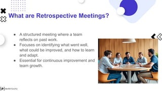 The document outlines the purpose and importance of retrospective meetings, which allow teams to reflect on past work to improve continuously. It introduces 'devactivity,' a tool that analyzes developer performance and generates insightful reports to enhance these meetings. By utilizing data-driven discussions and actionable insights from devactivity, teams can foster better communication, accountability, and overall performance.