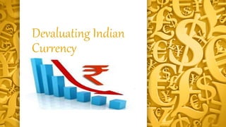 The document discusses the devaluation of the Indian rupee over time. It notes that the rupee was initially pegged to the US dollar at parity but has devalued significantly since India's independence. Major devaluations occurred in the 1960s-1970s due to wars and inflation, in the 1980s due to political instability, and in 1991 during economic liberalization when the rupee hit 24.58 rupees to the dollar. More recent fluctuations are due to factors like the US dollar strengthening, a rising current account deficit, and insufficient foreign investment inflows and outflows. Devaluation impacts trade, tourism, GDP, imports, exports, and foreign investment.