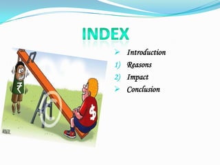 The Indian rupee hit an all-time low against the US dollar due to a large trade deficit caused by higher imports than exports. India also has a high current account deficit due to uncertainty over economic reforms and a slowing economy. As a result, demand for dollars is increasing from importers and investors seeking to move money out of India, while dollar inflows are decreasing. The falling rupee is negatively impacting companies with foreign debt but benefiting export sectors. The rupee's value will ultimately stabilize once inflation is brought under control.