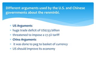 1) It outlines different arguments from the US and China regarding China's devaluation of the renminbi, with the US citing its large trade deficit and China saying the move pegged the currency to a basket of currencies.