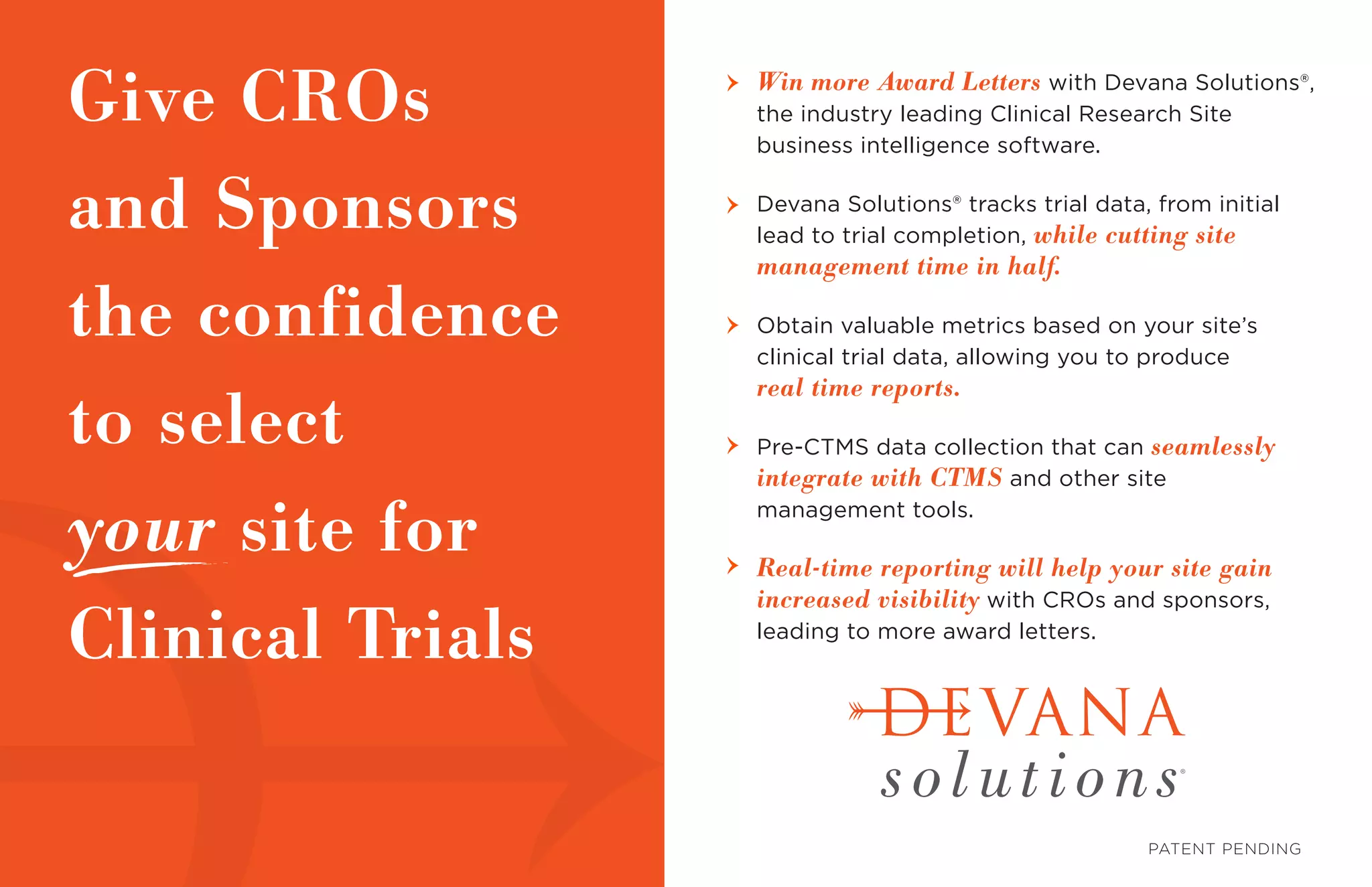 Devana Solutions® is a clinical research site business intelligence software that tracks trial data from lead to completion, cutting site management time in half. It provides real-time reports on valuable site metrics to help sites gain increased visibility with CROs and sponsors, leading to more award letters. The software allows for pre-CTMS data collection that can seamlessly integrate with CTMS and other site management tools.