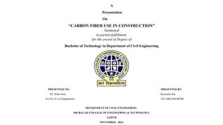 The document is a comprehensive presentation on the use of carbon fiber in construction, covering its properties, manufacturing processes, benefits, and challenges. It highlights carbon fiber's superior strength-to-weight ratio, corrosion resistance, and versatility for enhancing structural integrity in buildings and bridges, while also discussing sustainability and future trends in its application. Limitations such as high costs, installation complexity, and recycling challenges are noted, alongside recommendations for promoting its adoption in high-performance construction projects.