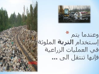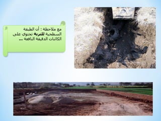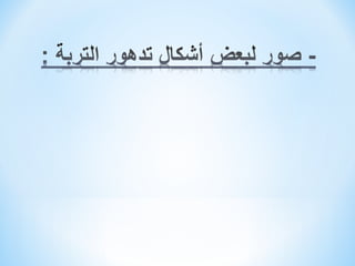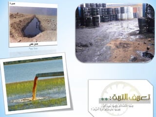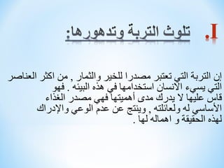 تتحدث الوثيقة عن تلوث وتدهور التربة، موضحة الأسباب مثل سوء الصرف والاستخدام المفرط للمبيدات، والتوسع العمراني. تشير أيضًا إلى الآثار المرتبطة بتدهور التربة على صحة الإنسان والبيئة، مثل نقص المواد الغذائية والتلوث. تشمل التربة أنواعًا مختلفة، مثل التربة الصحراوية والحتاتية، ويتم تقسيمها بناءً على مكوناتها وخصائصها.