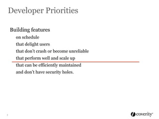 The document discusses how to integrate security into the software development process. It recommends treating security as part of design from the beginning through activities like threat modeling, rather than as an afterthought. It provides examples of common vulnerabilities and mitigations that can be implemented at the requirements, design, code, and testing phases like input validation, output escaping, and static analysis. The document advocates finding and fixing issues earlier and communicating regularly with security experts.