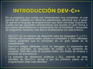Dev-C++ es un entorno de desarrollo integrado gratuito para los lenguajes C y C++ que incluye un editor, compilador, depurador y otras herramientas. Permite escribir, compilar y depurar código de manera fácil e integrada. El compilador verifica el código para errores y luego genera un archivo ejecutable. El depurador permite inspeccionar el valor de variables mientras se ejecuta el programa para encontrar y corregir errores. Dev-C++ es una herramienta útil para aprender a programar en