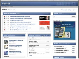 The document outlines the development of a mobile web interface at Loughborough for student self-service facilities, highlighting various APIs and integration phases. It discusses current and upcoming features, including single sign-on, widget creation, and performance enhancements aimed at improving usability. Future phases include mobile web interface enhancements and support for third-party widgets.