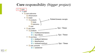 - The domain model is separated from technical concerns. Multiple bounded contexts may be defined to decompose large domains. Code is developed to closely align with the domain model.