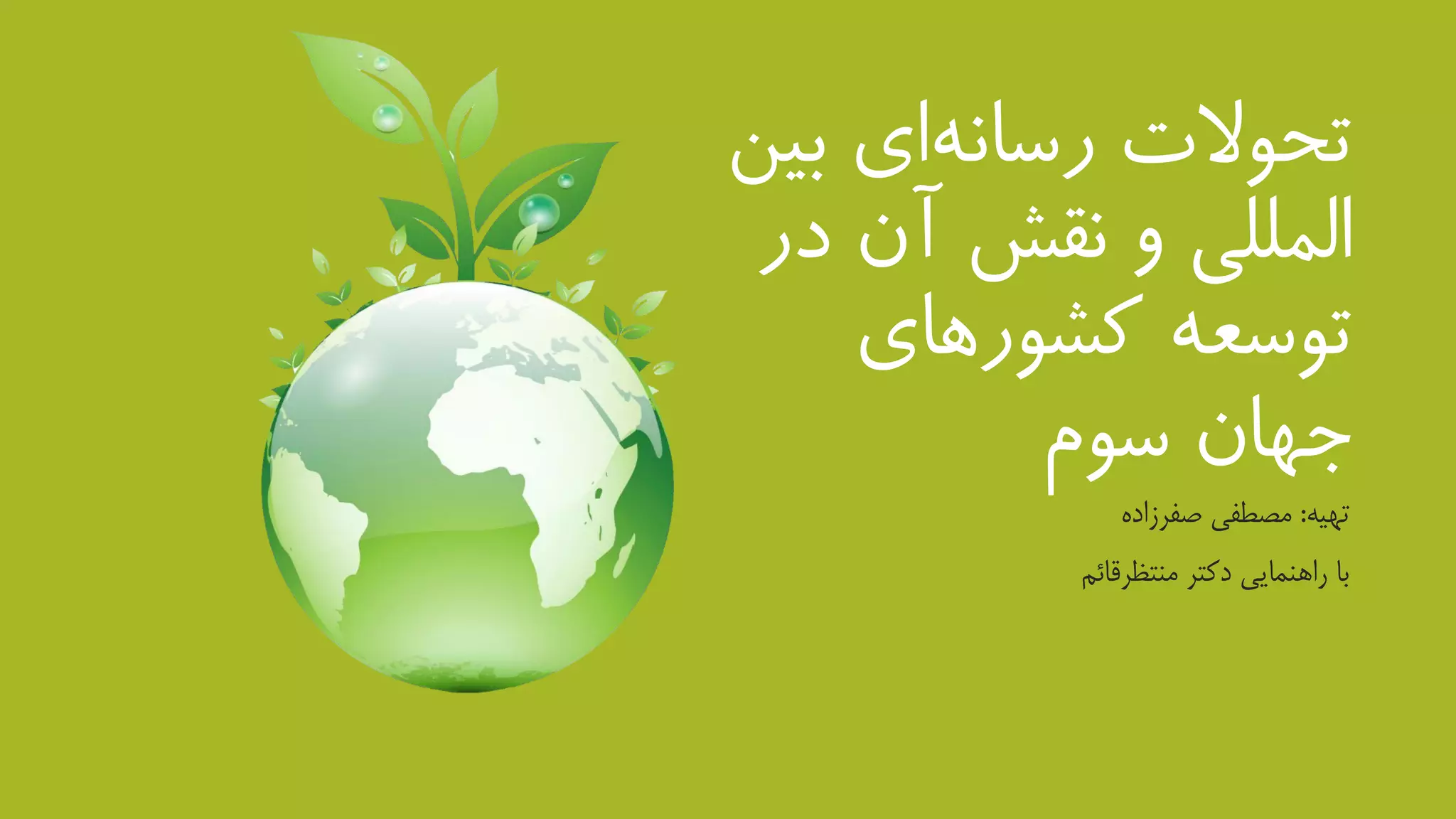 المللیبین جریان تغییر خصوصبه نوین ایرسانه تحوالتبه سویهیکتعامتواندمی هم لی هم و باشد سوم جهان کشورهای توسعه برای تهدیدیفرصت. •تهدیدآن اجرای عدم از بدتر سیاستی هر اشتباه اجرای که جهت این ازاست. •فرصتکننده تسهیل و بوده واقعی نیازهای از برخواسته تحوالت این باالخره که جهت این ازو فرایندها عملیاتهستند. •جامعههایشبکه از درست استفاده و توسعه درست راه کردن پیدا با تواندمی طرفی از ایشبکهارتباطی ع باعث هم فرایند این در اشتباه با تواندمی هم طرفی از و بپیماید راحتی به را توسعه مسیر،شود ثبات دم کند کم عموم نزد را طلبانهتوسعه اقدامات به نسبت اعتمادها هم و کند آفرینی اختالف هم. •تحوالتح در جهانی خانواده یک سمت به و اندبرده پیش شدن کوچک سمت به را جامعه ،ایرسانهرکت هستیم.مثبت تاثیر یکدیگر روی بر توانندمی مختلف هایبخش خانواده یک در که طورهمانمنفی یا ش حاصل تغییرات این از تواندمی ،توسعه برای منفی یا مثبت اتفاق دو هر هم جااین ،بگذارندود.
