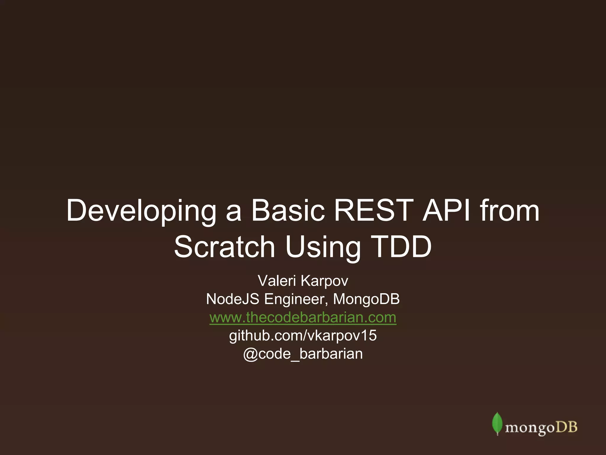 The document outlines a talk on developing a basic REST API using Node.js and MongoDB with a focus on test-driven development (TDD). It covers the creation of a shopping cart application, schema design principles, and the use of the Express framework along with Mongoose for handling MongoDB data. Additionally, it discusses testing strategies with tools like Mocha and Superagent while providing resources for further learning.