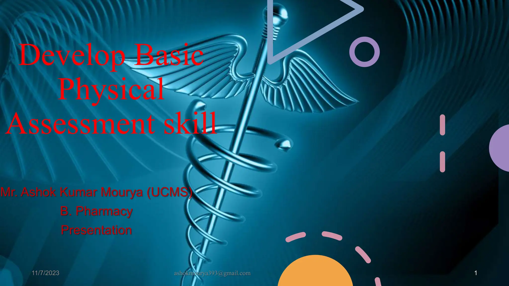 The document provides information on developing basic physical assessment skills. It begins with an introduction to physical assessment, which involves inspection, palpation, percussion, and auscultation done in sequence from the patient's right side. The document then lists the sequence of a typical physical assessment and provides details on the individual techniques, including inspection, palpation, percussion, and auscultation. It discusses assessing various body systems like the head and neck, chest, lungs, and ears. The goal is to evaluate objective anatomical findings through visual examination and use of hands-on techniques and medical devices to inspect the patient.