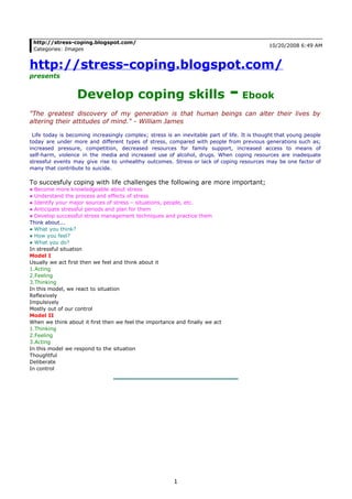 This document presents an ebook about developing coping skills for stress. It discusses how stress is an inevitable part of life today due to increased pressures and competition. When coping resources are inadequate, stressful events can lead to unhealthy outcomes like suicide. The ebook recommends becoming more knowledgeable about stress, understanding its effects, identifying stressors, anticipating stressful periods, and developing stress management techniques. It also discusses two models of how people think, feel and act in response to situations - reacting reflexively or responding thoughtfully. Developing skills like critical thinking, problem solving, communication, interpersonal skills, and self-regulation can help people better cope with stressful life events.
