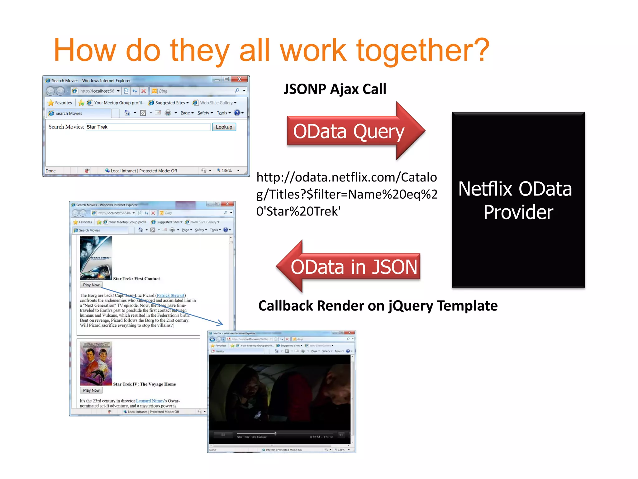 The document provides instructions for developing a Netflix movie search application using jQuery, OData, and JSONP. It includes steps to set up an HTML page, create a template for movie results, and make an AJAX call to the Netflix API for movie data. Instructions for implementing a movie playback feature using a Netflix developer account are also included.