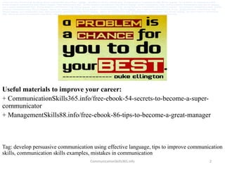 This document provides tips for improving communication skills. It discusses the importance of listening to others, over-communicating to ensure understanding, avoiding overreliance on visual aids, putting oneself in others' shoes, asking for honest feedback, engaging audiences, speaking to others directly instead of writing, accepting fears of public speaking, restating key points, understanding audience preferences, and focusing on respect over laughs. The overall message is that effective communication requires understanding others' perspectives, clearly conveying one's own message, and building respect.