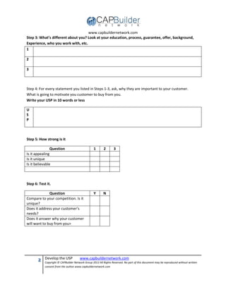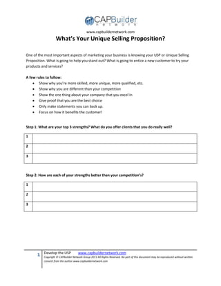 The document discusses developing a unique selling proposition (USP) for a business. It provides steps to identify a business's strengths, how they differ from competitors, what makes the business unique, and how these benefit customers. The steps include listing top strengths, how strengths are better than competitors, what else differs such as experience, then relating these back to customer benefits. It suggests writing the USP in 10 words or less and testing how appealing, unique, and believable it is compared to competition and if it addresses customer needs.