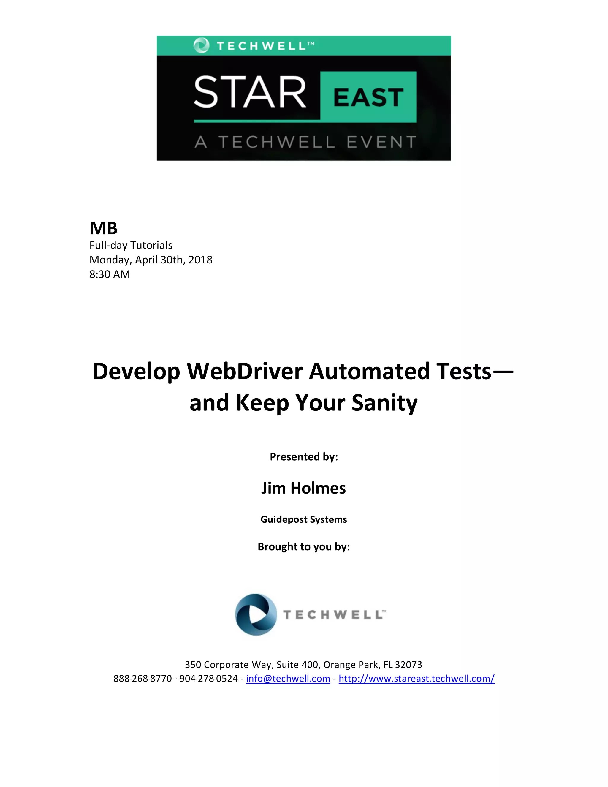 The document details a full-day tutorial by Jim Holmes on developing WebDriver automated tests, emphasizing best practices and strategies for effective testing in software delivery. It covers various testing types, practical coding tips, and the importance of maintaining a reliable test suite. The presentation also highlights the significance of risk and value in determining testing approaches, along with resources for further learning.