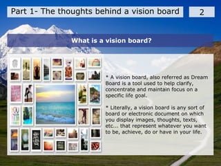 The document outlines the concept and creation of vision boards, which are tools that help individuals clarify and focus on their life goals through visual representation. It details the process of developing a vision board, including defining themes, gathering images and texts, writing affirmations, and maintaining the board as a living document. Additionally, it emphasizes the importance of action planning in conjunction with vision boards to translate thoughts into actionable steps for achieving desired outcomes.