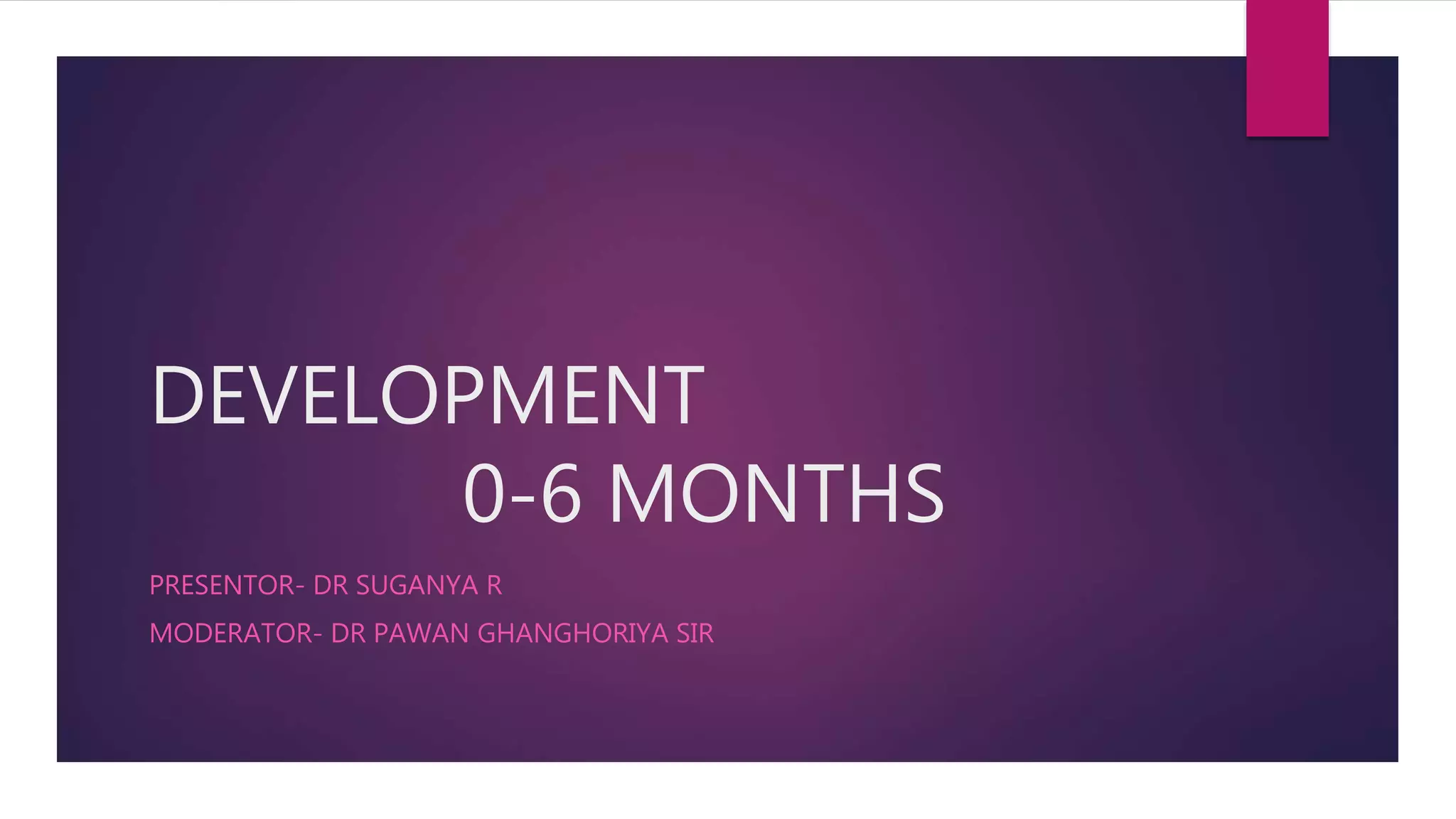 The document discusses the developmental milestones and behavioral assessments of infants from birth to 6 months, covering somatic, neurological, behavioral, and social development. It highlights key milestones in locomotion, fine motor skills, social interaction, language development, and sensory capabilities, along with indicators of potential developmental delays. Two case studies are presented to illustrate the assessment of developmental issues and the importance of follow-up evaluations.