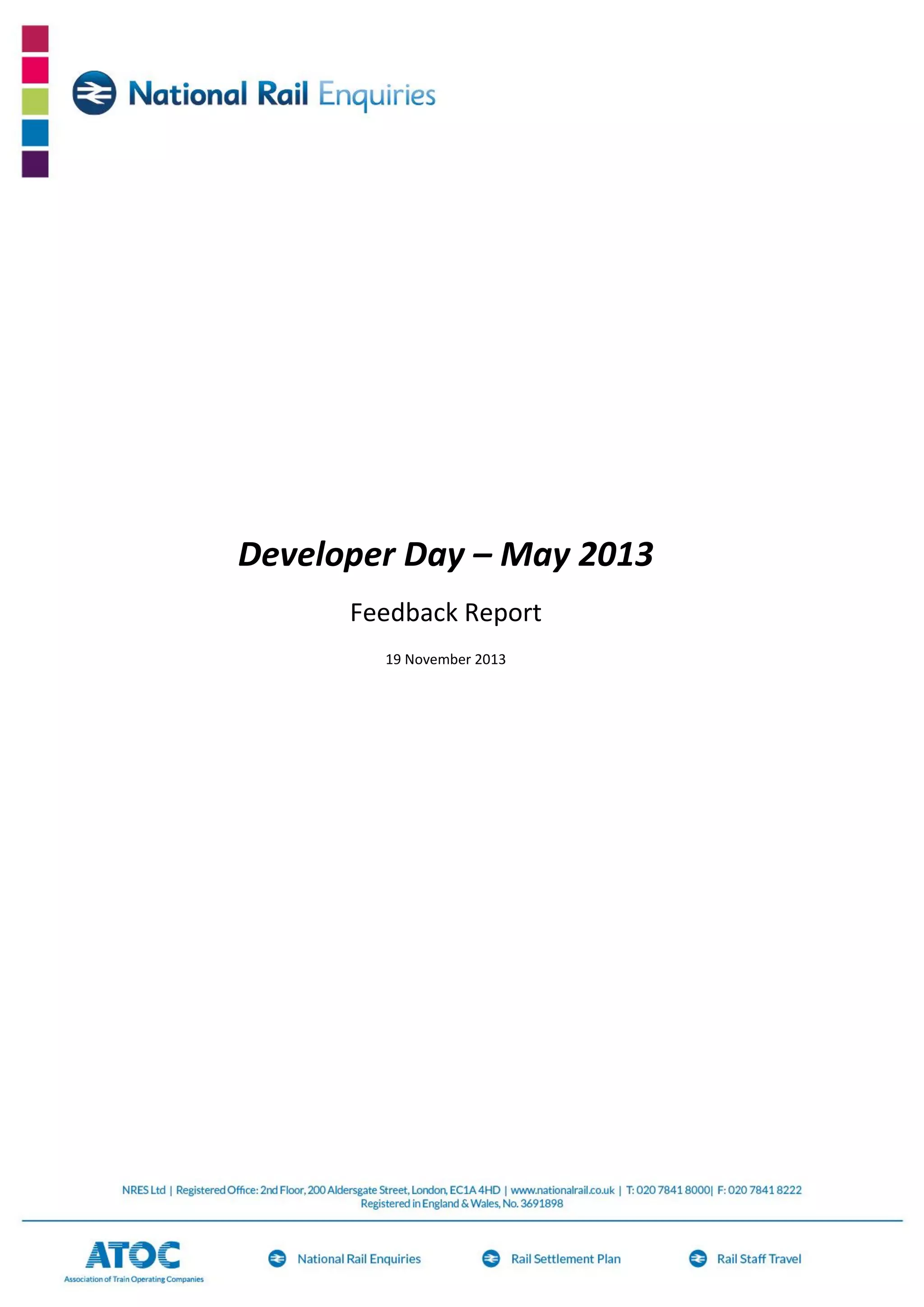 The NRE developer day feedback report discusses various requests and responses, highlighting that NRE will not provide access to staff versions of their products due to privacy and resource limitations, despite potential future licensing possibilities. Additionally, a push notifications functionality for third-party apps could be developed for £20k if funding is provided, while a disruptions web service is approved and set to launch in March 2014 at no extra cost. JSON/XML feed formats have not been scoped yet but are not ruled out, and there are currently no plans to promote third-party apps on the NRE website.