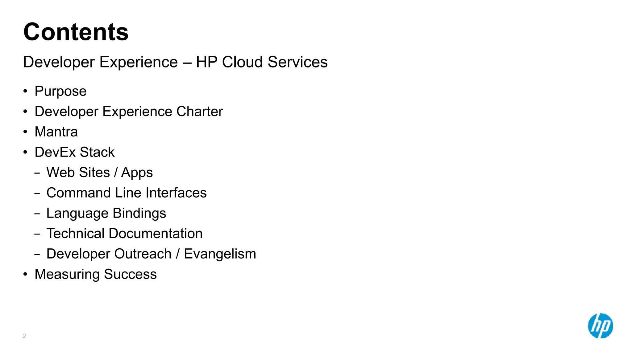 The document discusses HP Cloud Services' Developer Experience (DevEx) strategy. DevEx aims to provide developers with simple, transparent, and consistent interfaces across websites, APIs, command line tools, and language bindings. Key aspects of the DevEx stack include open source Ruby and Java libraries, Unix/Mac and PowerShell command line interfaces, marketing and documentation websites built on Drupal, and a community forum. The goal is to put developers first and help HP Cloud Services succeed by strategically differentiating its public cloud experience.