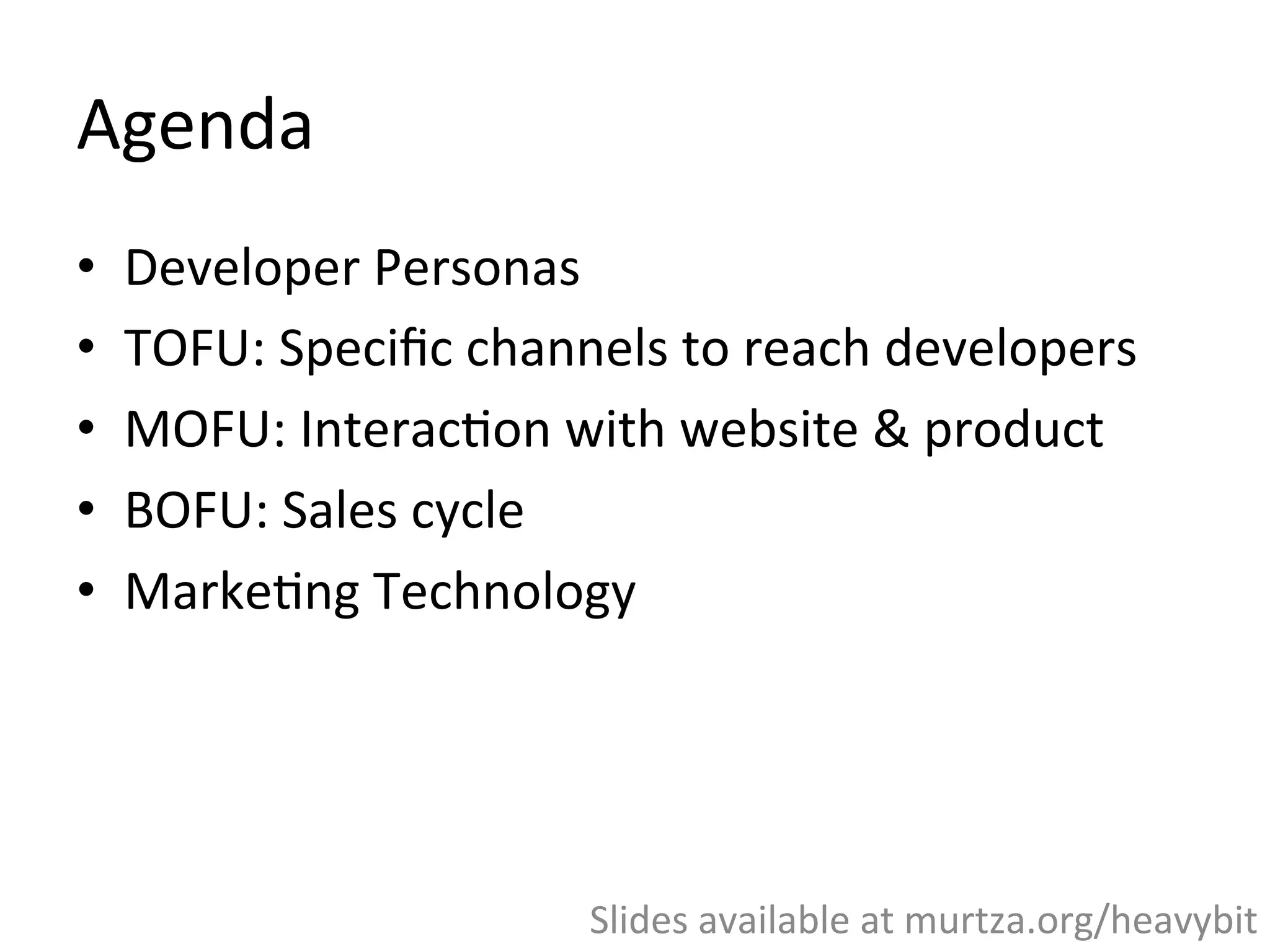 The document outlines strategies for marketing to developers, focusing on different stages of the developer acquisition funnel: top of funnel (awareness), middle of funnel (interaction), and bottom of funnel (sales cycle). It emphasizes understanding developer personas, utilizing various online and offline channels for engagement, and leveraging marketing technology for optimization. Case studies from companies like New Relic and Stripe illustrate practical applications of these strategies.