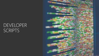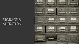 The document discusses various tools and techniques related to Azure services, focusing on storage, migration, and automation. It includes information on managing virtual machines, performing migrations with Azure Cosmos DB, and features for handling latency and performance estimation. Additionally, it provides scripts for managing Azure resources and maintaining security and governance.