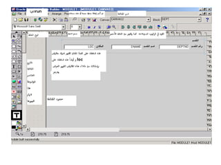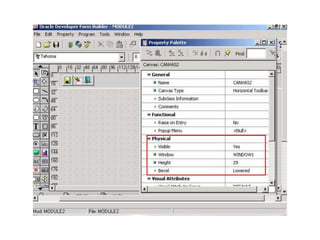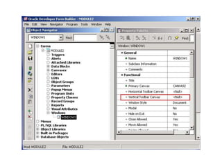 يقدم مستند معهد دراسات أوراكل دليلاً لتنصيب وتخصيص بيئة تطوير البرمجيات الخاصة بأوراكل. يتضمن الشرح توجيهات خطوة بخطوة لتشغيل الأدوات اللازمة، مثل Form Builder و Object Navigator، لإنشاء النماذج والتقارير باستخدام واجهة المستخدم الرسومية. كما يتناول كيفية استخدام المكونات المختلفة داخل البيئة، بدءًا من إنشاء النماذج إلى التعامل مع قواعد البيانات.