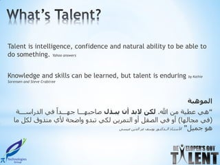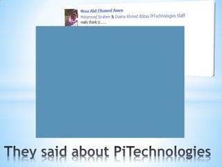 PiTechnologies provides technical training courses in Egyptian universities. Students provided positive feedback about the Developer's Got Talent course, praising it for combining enjoyment, comfort, and learning. They felt it helped develop both technical and soft skills. Students said they benefited from the project-based learning approach and felt it set them apart from other courses. The company aims to improve Egypt's ranking in the IT outsourcing industry.