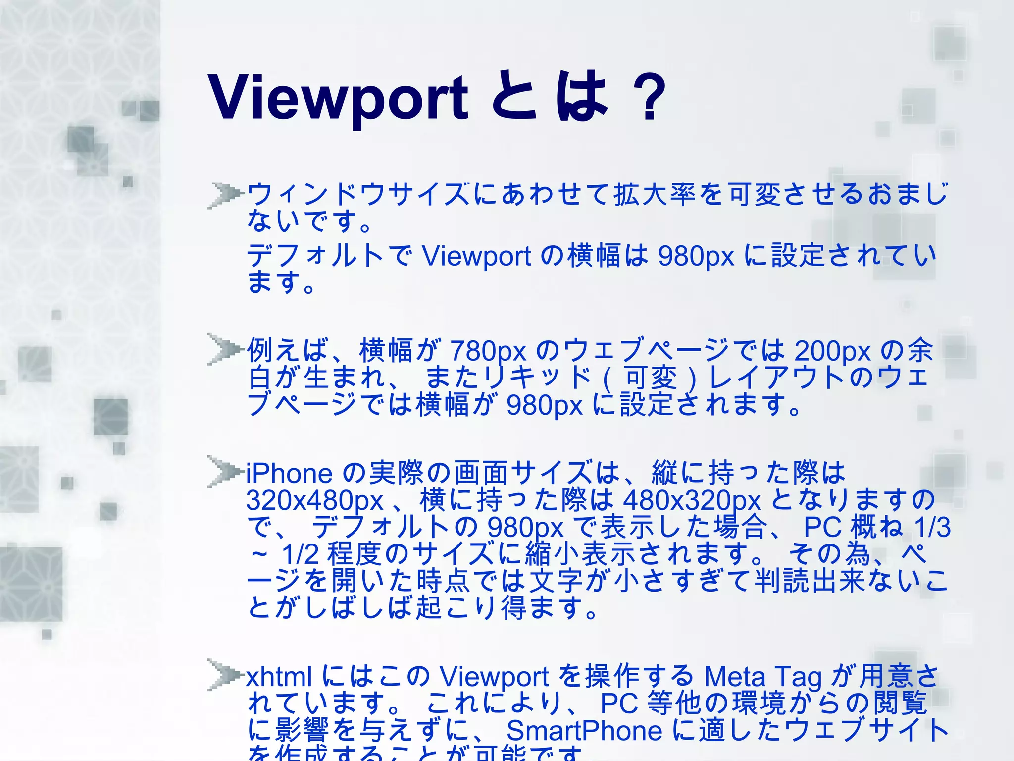 の横幅は 980px に設定されてい ます。 例えば、横幅が 780px のウェブページでは 200px の余 白が生まれ、 またリキッド(可変)レイアウトのウェ ブページでは横幅が 980px に設定されます。 iPhone の実際の画面サイズは、縦に持った際は 320x480px 、横に持った際は 480x320px となりますの で、 デフォルトの 980px で表示した場合、 PC 概ね 1/3 ~ 1/2 程度のサイズに縮小表示されます。 その為、ペ ージを開いた時点では文字が小さすぎて判読出来ないこ とがしばしば起こり得ます。 xhtml にはこの Viewport を操作する Meta Tag が用意さ れています。 これにより、 PC 等他の環境からの閲覧 に影響を与えずに、 SmartPhone に適したウェブサイト