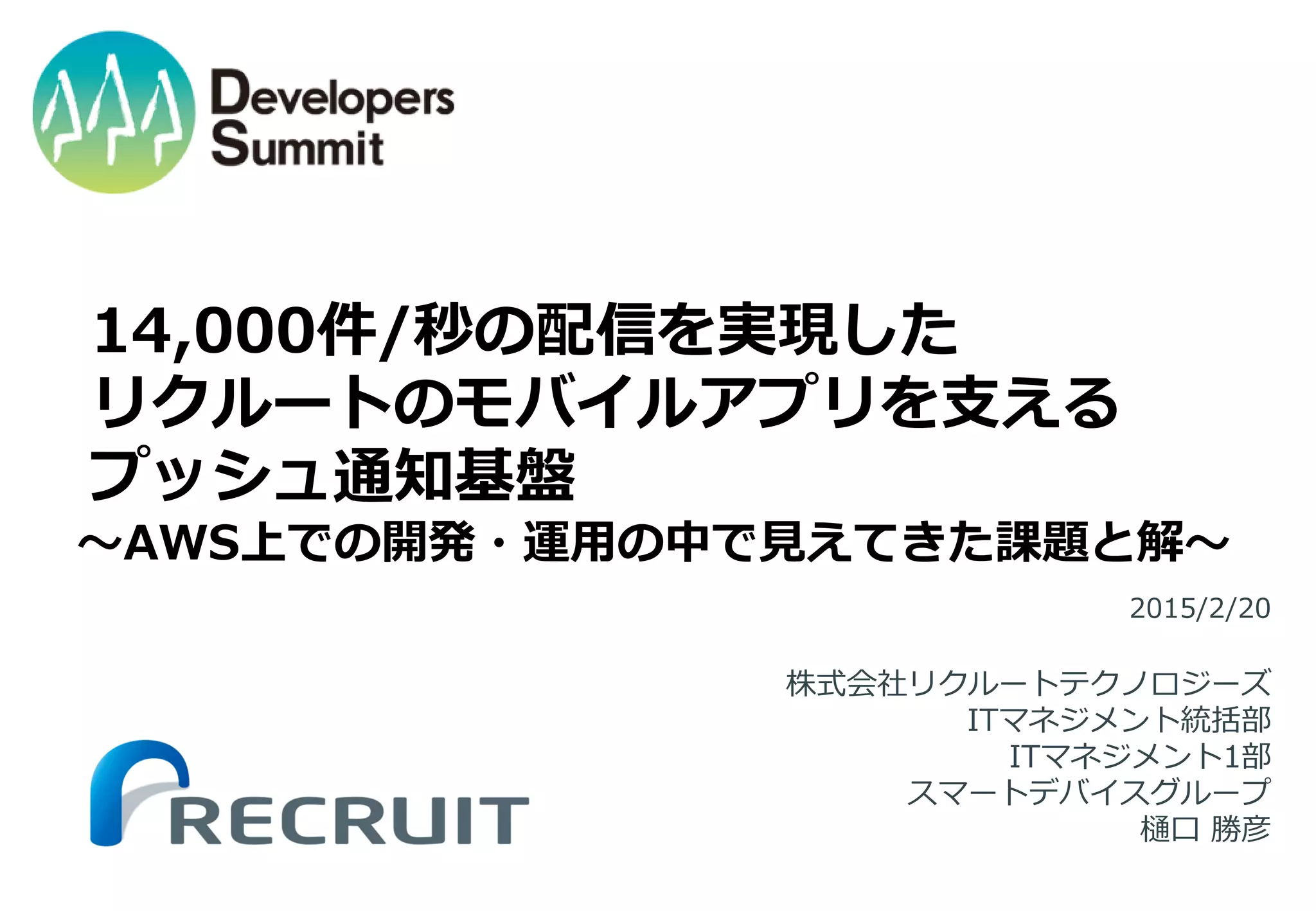 Developers Summit 2015において、リクルートテクノロジーズの樋口が講演をしたスライドになります。『14,000件/secの配信を実現したリクルートのモバイルアプリを支えるプッシュ通知基盤 ~AWS上での開発・運用の中で見えてきた課題と解』